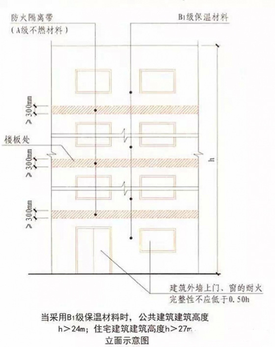4.當(dāng)建筑的外墻外保溫系統(tǒng)采用燃燒性能為B1、B2級的保溫材料時(shí),除采用B1級保溫材料且建筑高度不大于24米的公共建筑或采用B1級保溫材料且建筑高度不大于27米的住宅建筑外,建筑外墻上門、窗的耐火完整性不應(yīng)低于0.5小時(shí)。