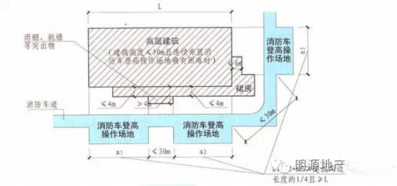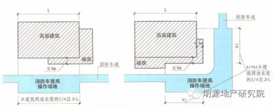 1)高層建筑應(yīng)至少沿一個長邊或周邊長度的l/4且不小于一個長邊長度的底邊連續(xù)布置消防車登高操作場地,該范圍內(nèi)的裙房進(jìn)深不應(yīng)大于4米;