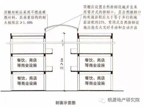 5.步行街兩側(cè)建筑的商鋪,其面向步行街一側(cè)的圍護(hù)構(gòu)件的耐火極限不應(yīng)低于1小時(shí)。相鄰商鋪之間面向步行街一側(cè)應(yīng)設(shè)置寬度不小于1米、耐火極限不低于1小時(shí)的實(shí)體墻;當(dāng)步行街兩側(cè)的建筑為多個樓層時(shí),每層面向步行街一側(cè)的商鋪均應(yīng)設(shè)置防止火災(zāi)豎向蔓延的措施;