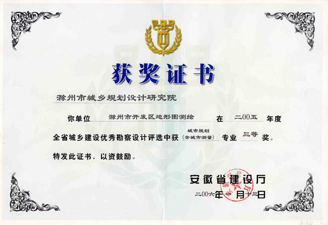 滁州市經(jīng)開區(qū)地形圖測繪規(guī)劃獲獎證書