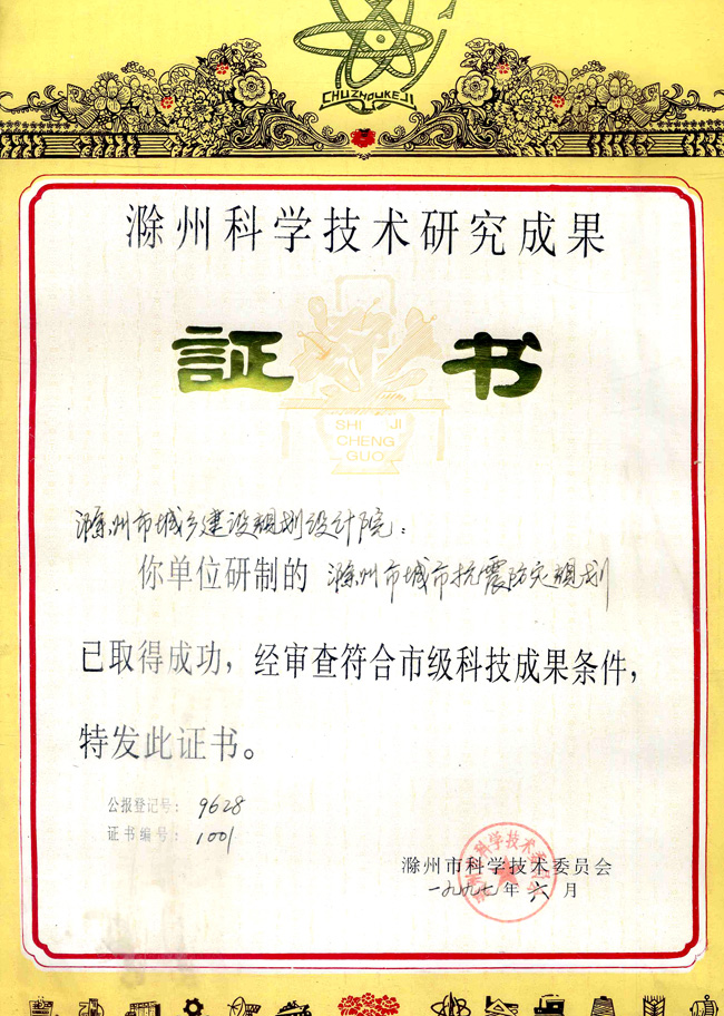 滁州市抗震防災規(guī)劃(市級科技成果)