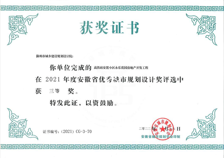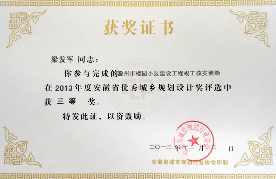 滁州市經開區(qū)地形圖測繪規(guī)劃獲獎證書